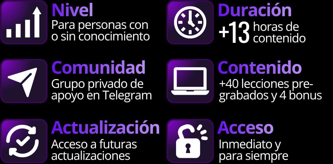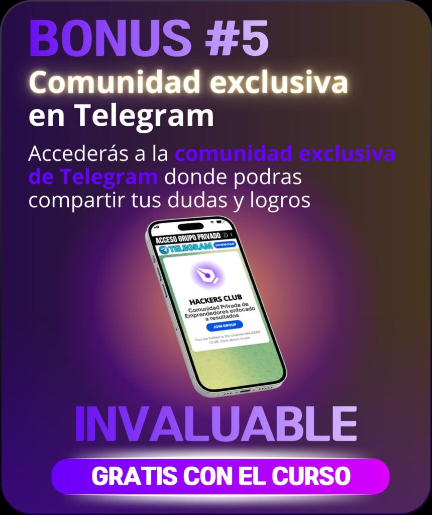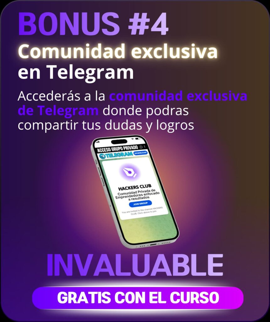 Después de inscribirte, recibirás un correo con el acceso a nuestra plataforma en Hotmart donde podrás ver todas las clases y recursos. Dentro, encontraras el link para que te unas a la comunidad exclusiva de Telegram.